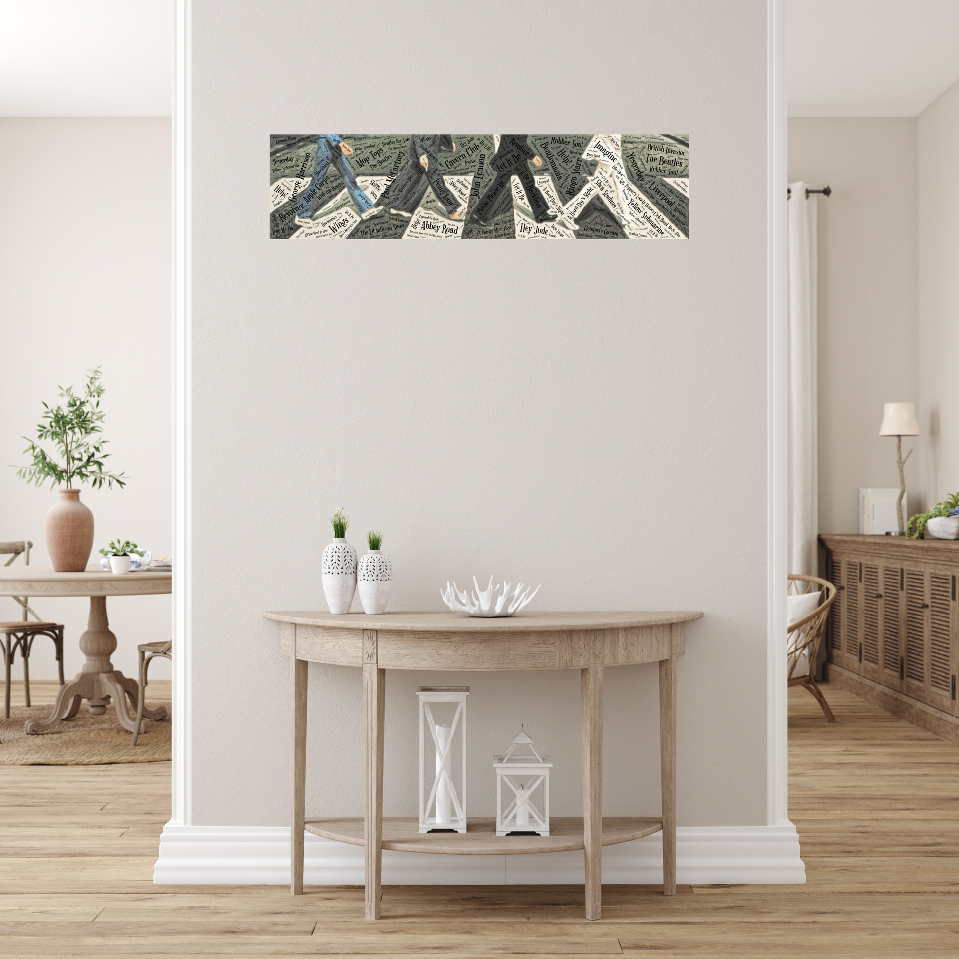Walk the line of music history with this 24"x6" ceramic wall tile featuring a stylized tribute to Abbey Road and the enduring magic of The Beatles. The iconic crosswalk silhouette of George, Paul, John, and Ringo anchors a vibrant collage of song titles, album names, and cultural touchstones—from “Hey Jude” and “Let It Be” to “Sgt. Pepper” and “The Ed Sullivan Show.” Every inch of this unframed tile hums with nostalgia, lyricism, and British rock royalty. A must-have for vinyl lovers, Beatlemaniacs, and anyone who knows that all you need is love (and a little Lennon).