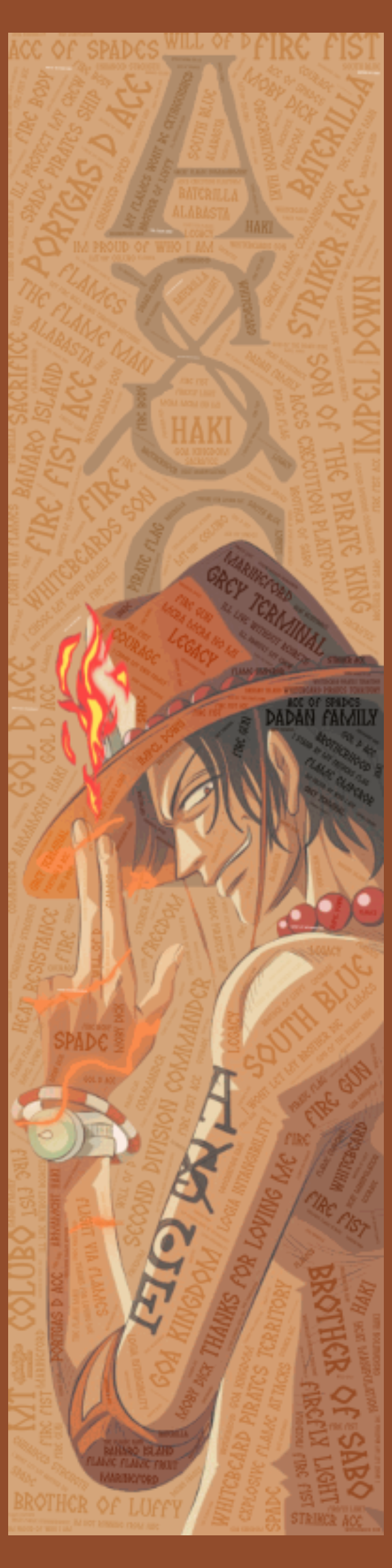 A Literal "Heat Map": The background is a dense word cloud of Ace’s fiery legacy, featuring titles like "Fire Fist," "Son of the Pirate King," and "Second Division Commander". It also catalogs his travel history, from the Goa Kingdom to the less-than-ideal vacation spot, Impel Down.
