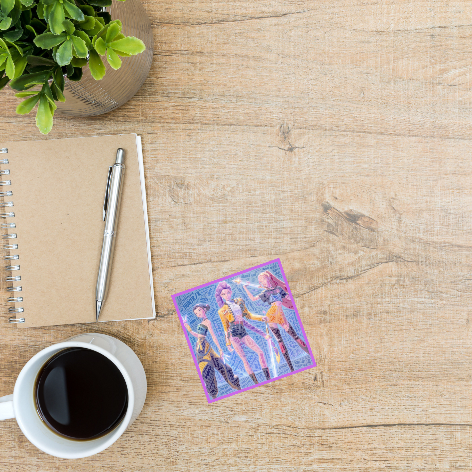 This electrifying design explodes with attitude, featuring the fierce trio—Rumi, Mira, and Zoey—from Netflix’s animated hit K-Pop Demon Hunters. Drenched in vibrant color and layered with chaotic typography, the design channels the group's dual identity as pop idols and demon slayers. Buzzwords like “FLIGHT ATTENDANT DEMON,” “IDOL AWARDS,” and “DIS-TRICK” swirl around the characters, capturing the mashup of glam, grit, and supernatural swagger that defines Huntr/x. A must-have for fans who live for bold visuals and lore-rich fandoms.