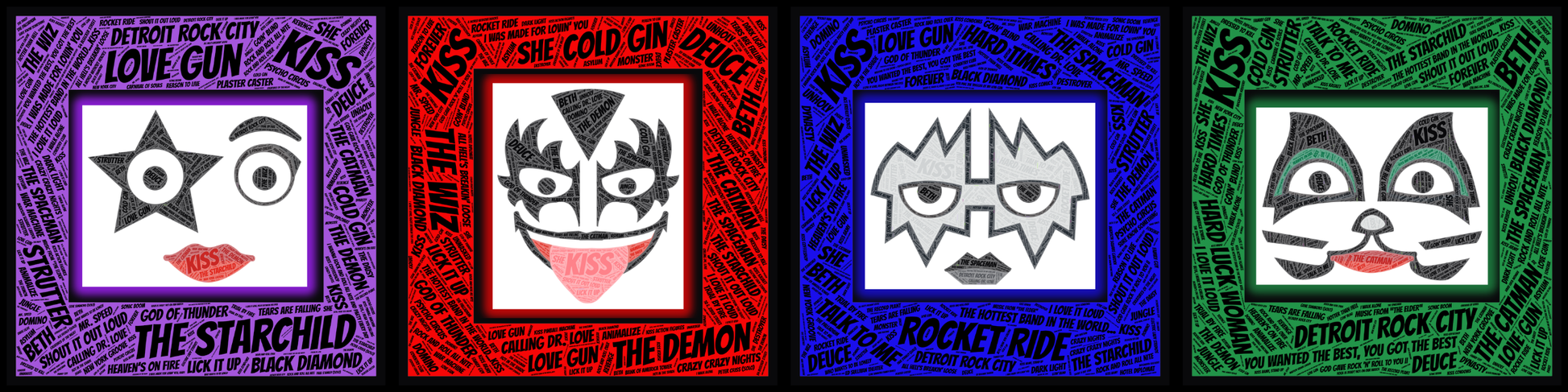 Turn it up to eleven with this 24"x6" ceramic wall tile featuring four electrifying portraits of KISS legends: The Starchild, The Demon, Rocket Ride, and The Catman. Each stylized face is framed by a riot of song titles—from “Detroit Rock City” to “God of Thunder”—creating a visual setlist that screams rock ‘n’ roll. Bold colors, signature makeup, and dynamic typography make this tile a tribute to the loudest band in the land. Whether you're a vinyl junkie or a glam-metal lifer, this piece hits all the right notes.